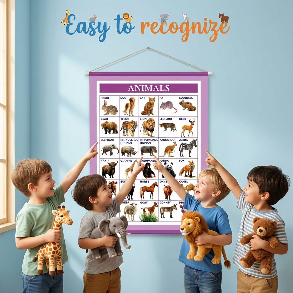 This chart features a wide variety of domestic and wild animals with clear names and realistic images, helping children easily identify and remember different animals. It is perfect for building vocabulary, improving recognition skills, and developing general knowledge from an early age.